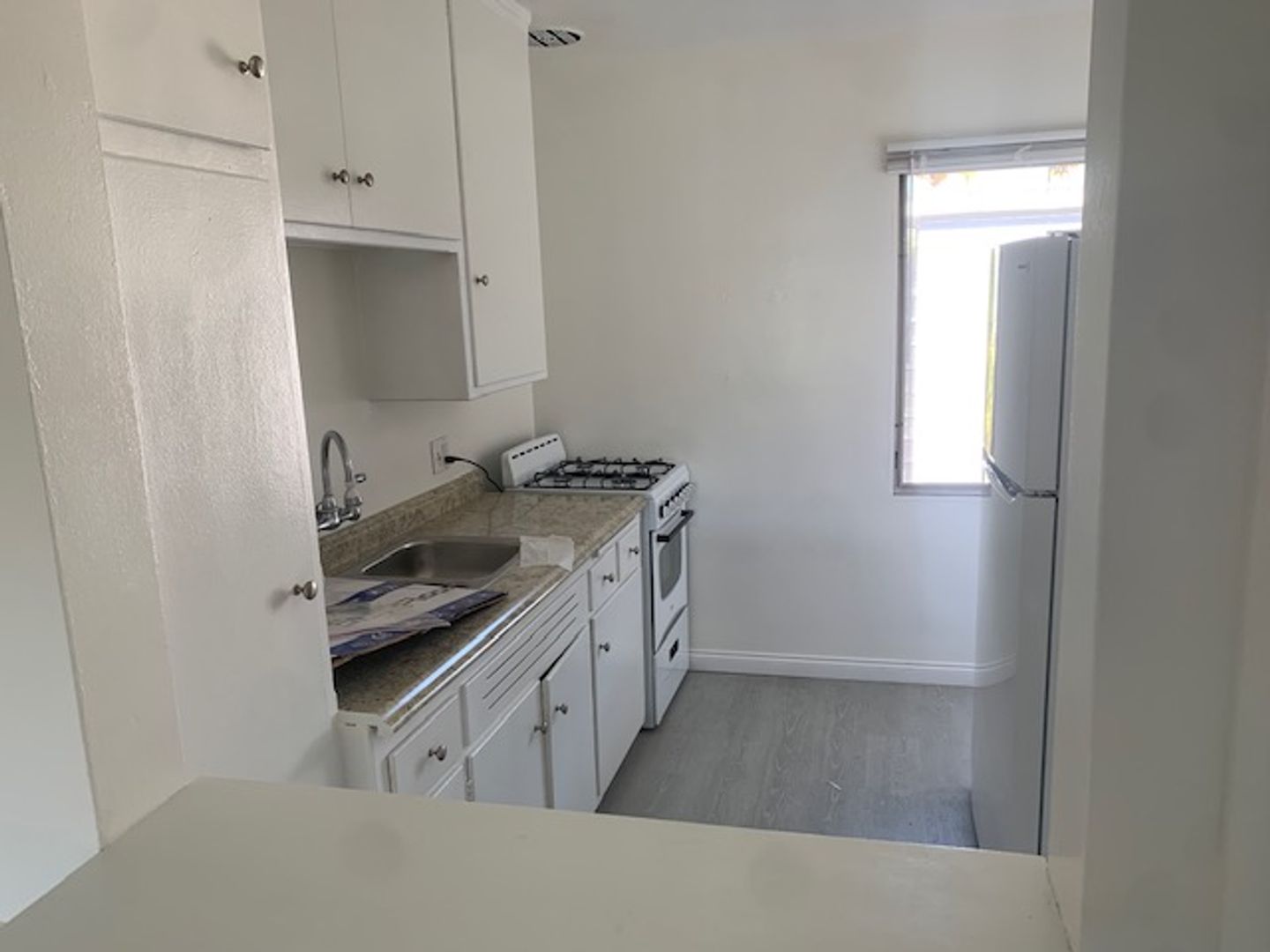 2nd Floor apartment in a courtyard building, New vinyl flooring, high ceilings, refrigerator, stove, swimming pool, laundry in building, 1 parking, will consider cat.